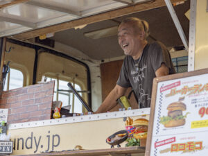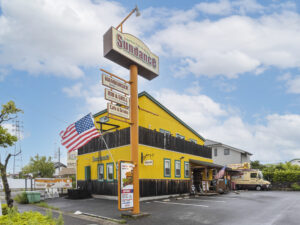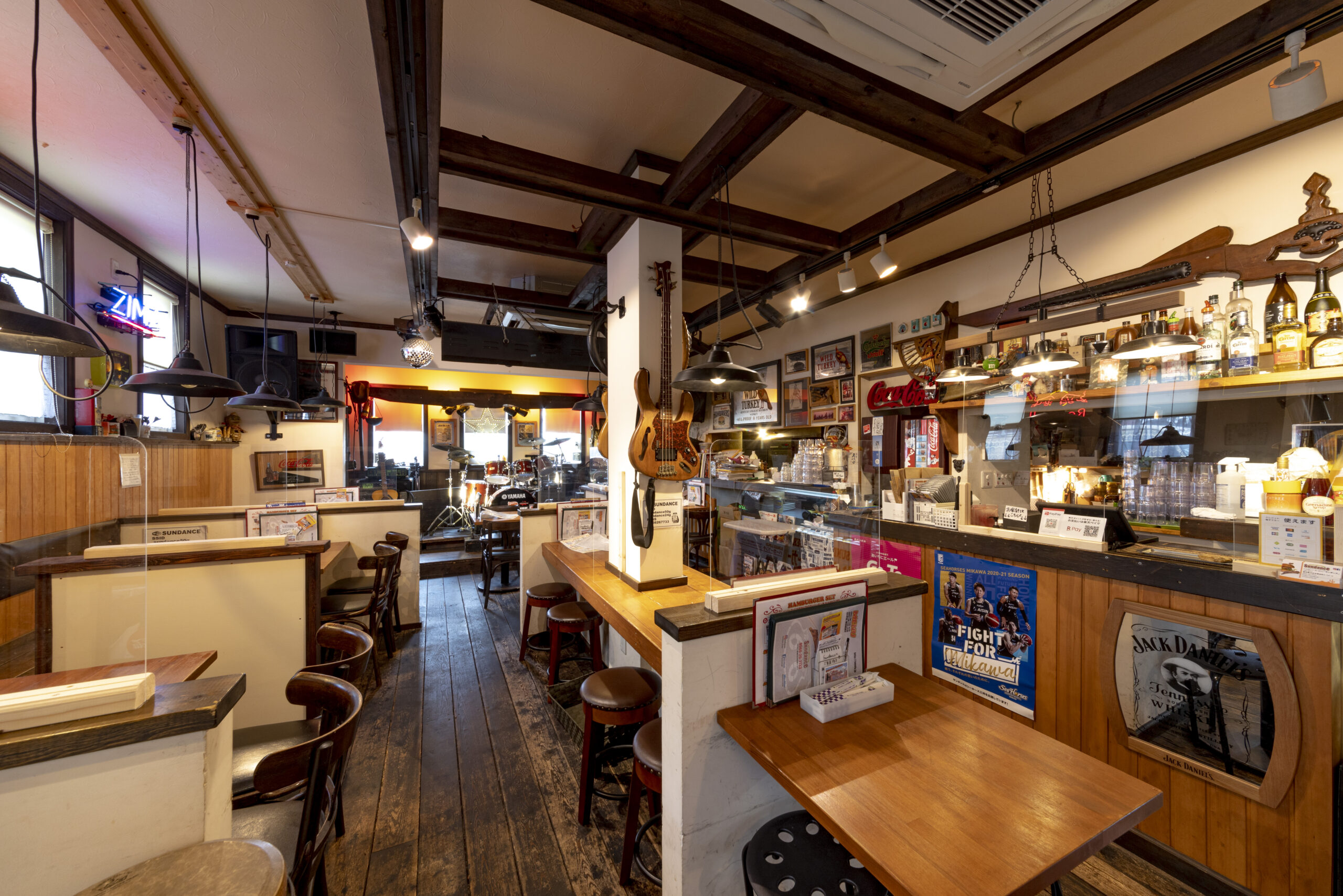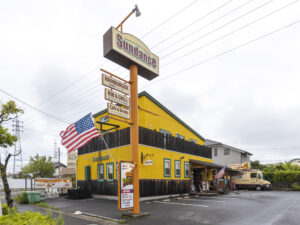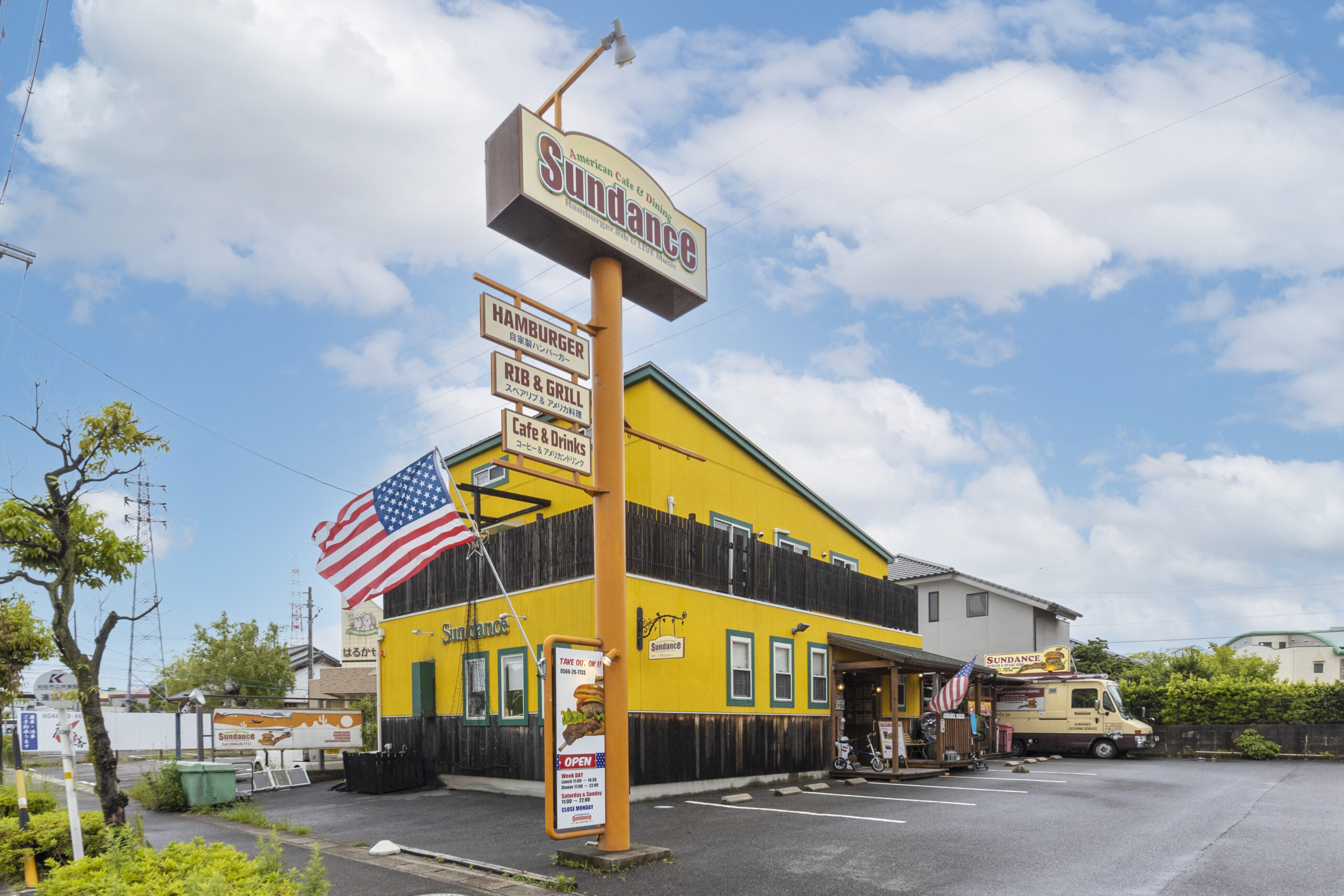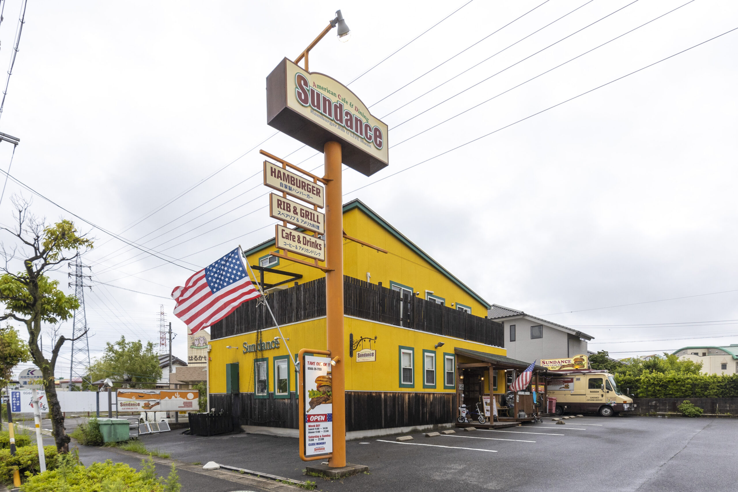サンダンスは愛知県刈谷市にあるアメリカンスタイルのバーガーカフェです。店舗外観、大人気のやわらかスペアリブ。直径、高さ12cmのジャンボなハンバーガーの写真を撮りました。
